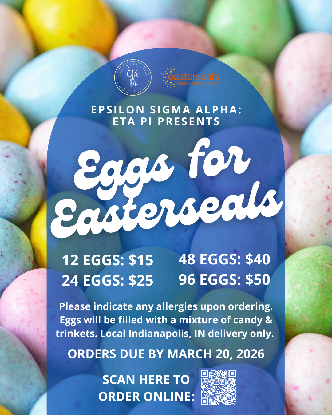 Take the work out of Easter and order pre-filled eggs from the Eta Pi: Fishers chapter! All proceeds benefit Easterseals Crossroads. Order 12 eggs for $15, 24 eggs for $25, 48 eggs for $40, or 96 eggs for $50. Order online at https://www.zeffy.com/en-US/ticketing/eggs-for-easterseals or from any Eta Pi member. Eggs will be delivered after March 25, 2026. Local Indianapolis, IN and surrounding areas only.