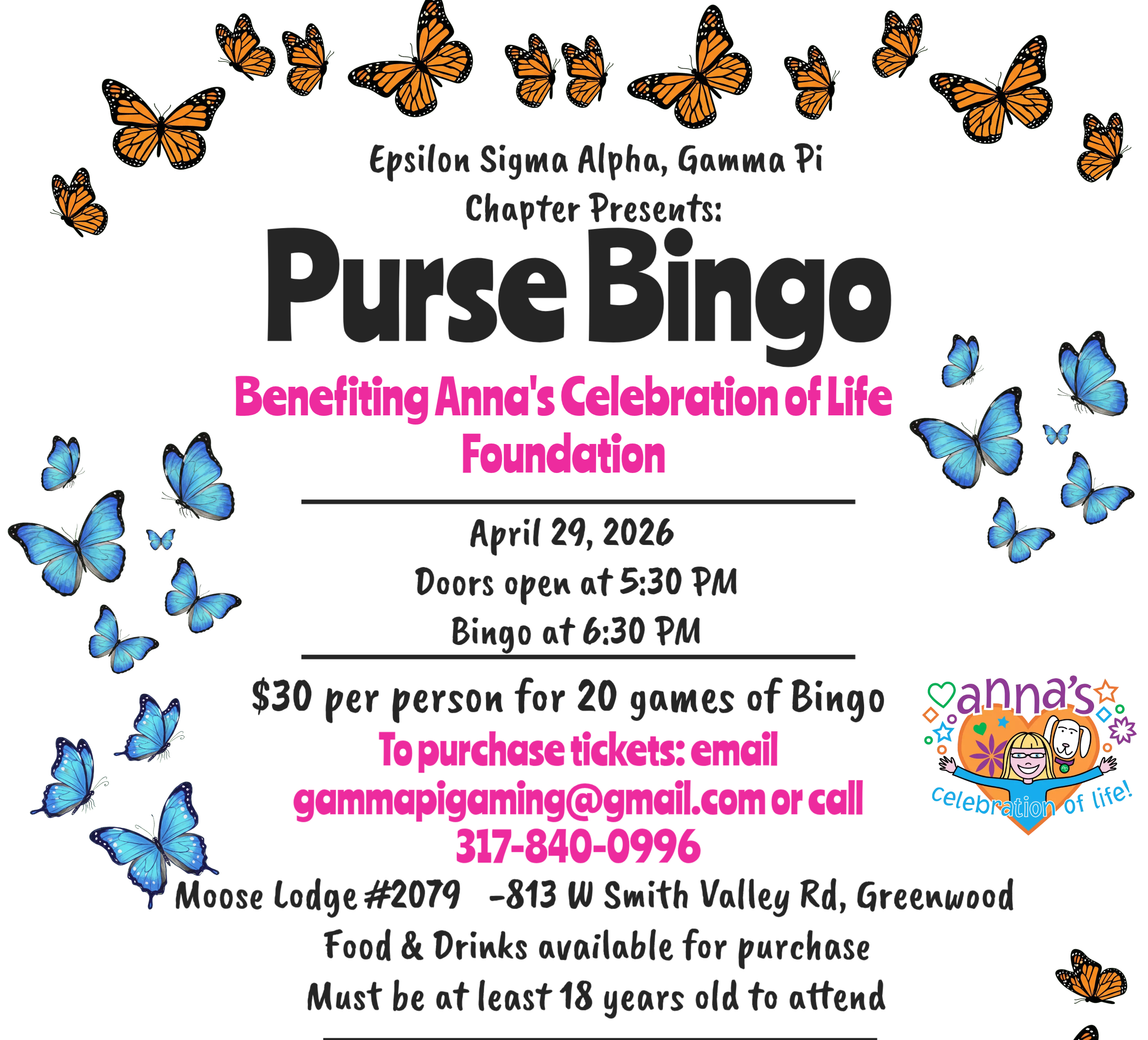Join the Gamma Pi: Indianapolis chapter for their annual Purse Bingo benefiting Anna’s Celebration of Life Foundation on April 29 at the Greenwood Moose Lodge #2079! Doors open at 5:30 pm and bingo will begin at 6:30 pm. Tickets are $30 and get you 20 games of bingo! To purchase tickets, email gammapigaming@gmail.com or call 317-840-0996. Food and drinks will be available for purchase and you must be at least 18 years old to attend. There will also be a gift card raffle, purse raffle, and extra bingo sheets available for purchase! You can also bring in non-perishable food items for Anna’s House and you will receive a ticket into a special raffle!