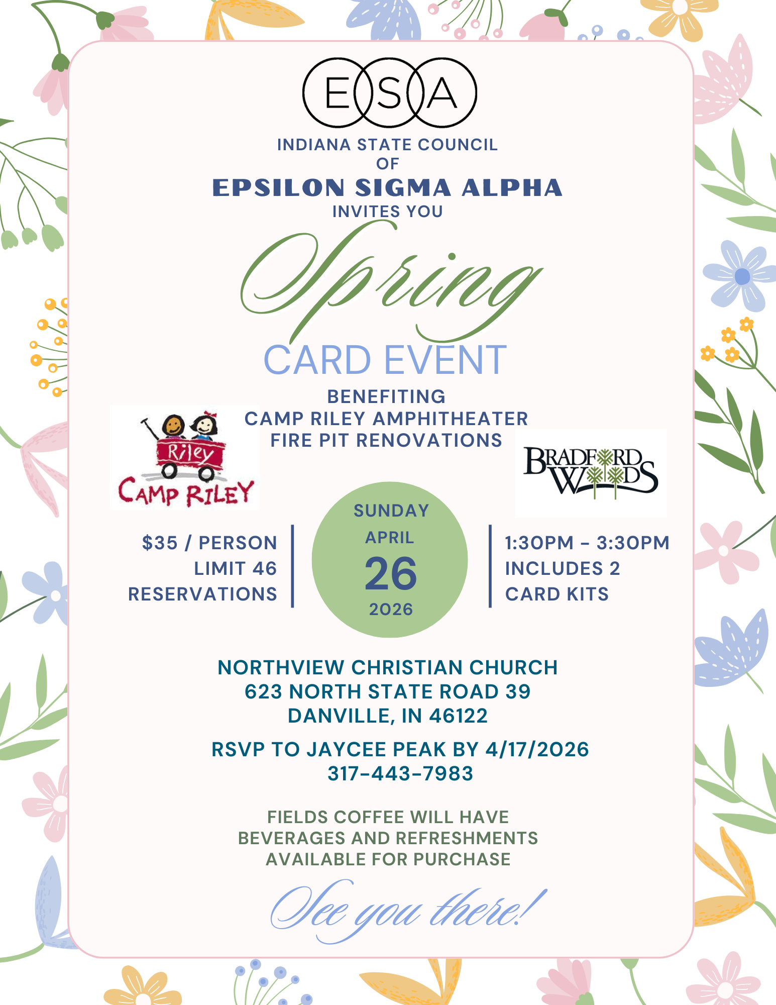 Indiana ESA invites you to a spring card-making event on April 26 benefiting Camp Riley as we fundraise towards improving the amphitheater and fire pit! Admission is $35 and includes two card-making kits. The event will take place at Northview Church in Danville, and Fields Coffee will have beverages and refreshments available to purchase. There is a 46 spot limit, so RSVP and save your spot today! RSVP to Jaycee Peak at 317-443-7983 by April 17, 2026.